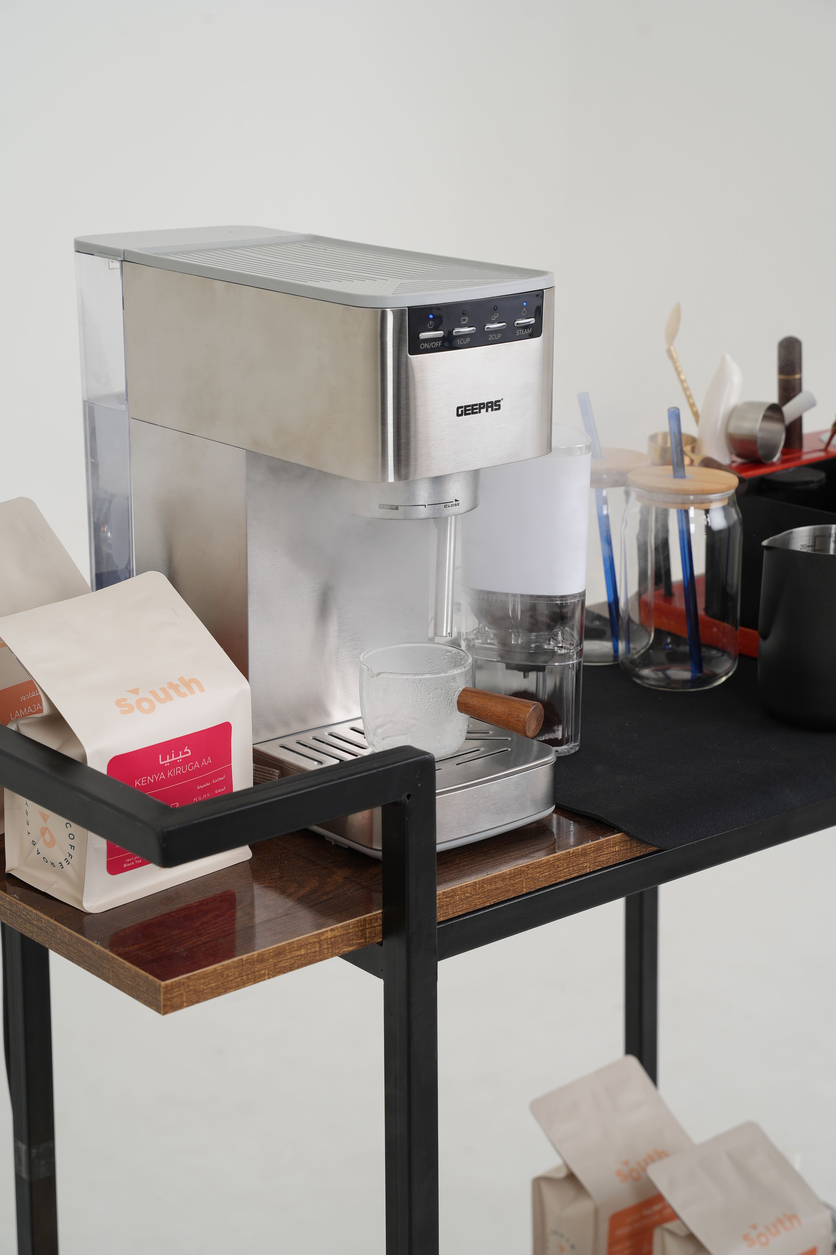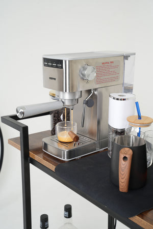 Equipped with the famous geepas espresso machine featuring 20 Bar pressure system for lattes and cappuccinos, plus an electric auto coffee grinder, this station ensures every cup is crafted to perfection.